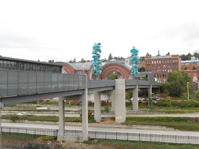 Since we were in Tacoma when we went to bed last night, all we had to do was get downtown Tacoma. We entered the city by passing by two large, blue glass pieces of art on either side of the street. A Chihuly!